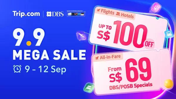 From 9 to 12 September, Trip.com's 9.9 Mega Sale will be bringing you an exciting line-up of travel deals. From S$100 discount coupons that drop daily at midnight, to All-in-Fare and Buy 1 Get 1 Free flight and attraction deals, to hotel flash sales and up to 50% off car rentals and up to S$199 off Group or Private Tours, get ready to unlock incredible savings when you book your next trip with Trip.com.