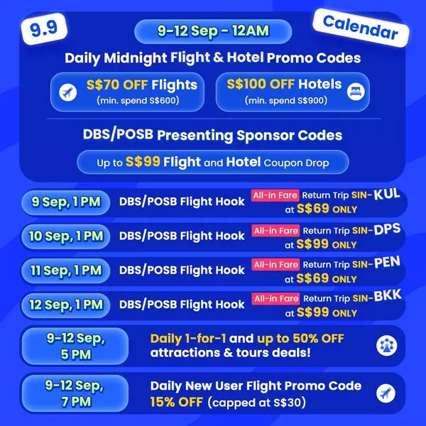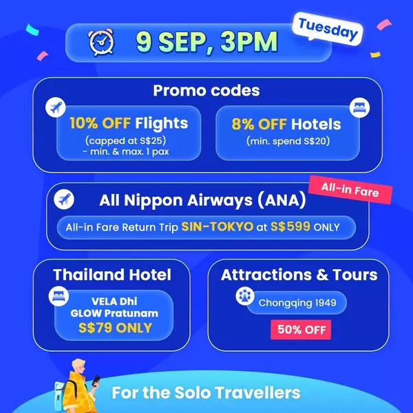 Score up to S$100 OFF Flight and Hotel Bookings with Daily Midnight Coupon Drops, All-in-Fare Deals and a Buy 1 Get 1 Free Deal: Get ready to snag the biggest travel discounts of the season from 12am on 9 September. With limited coupons up for grabs at midnight each day, only the fastest fingers will get to claim these unbeatable travel deals. | |