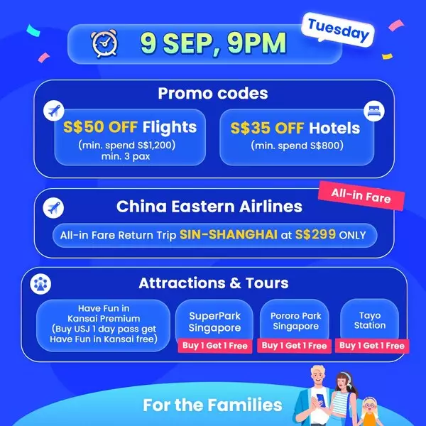 Grab Unbeatable Flight Deals, including S$599 return flights to Tokyo on All Nippon Airways: Brace yourself to grab the special Buy 1 Get 1 Free deal on Korean Air flights from 9am on 9 September! Additionally, don't miss out on All-in-Fare flight deals on 9 September, with S$599 return flights to Tokyo on All Nippon Airways available from 3pm, and S$299 return flights to Shanghai on China Eastern Airlines at 9pm up for grabs.