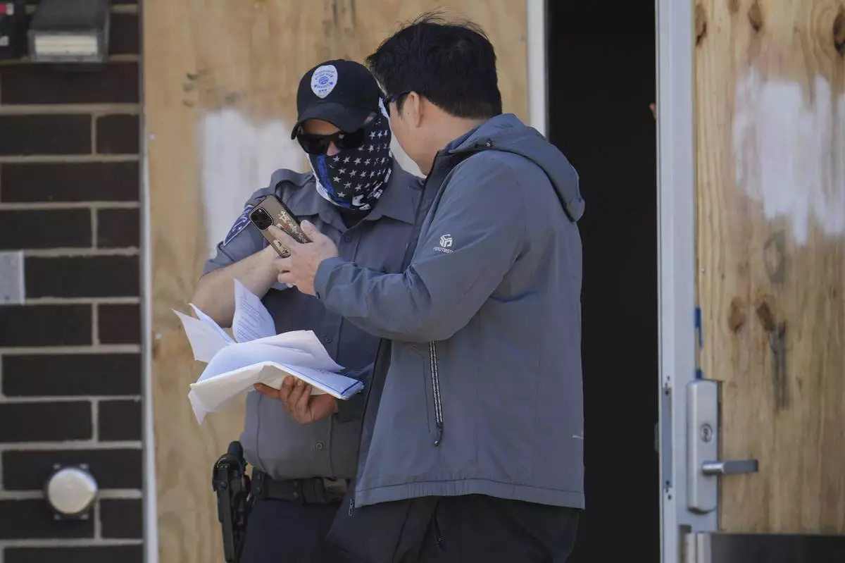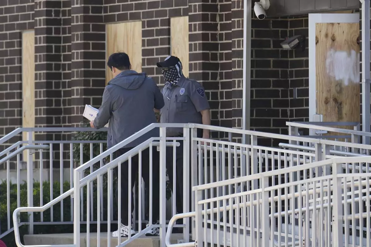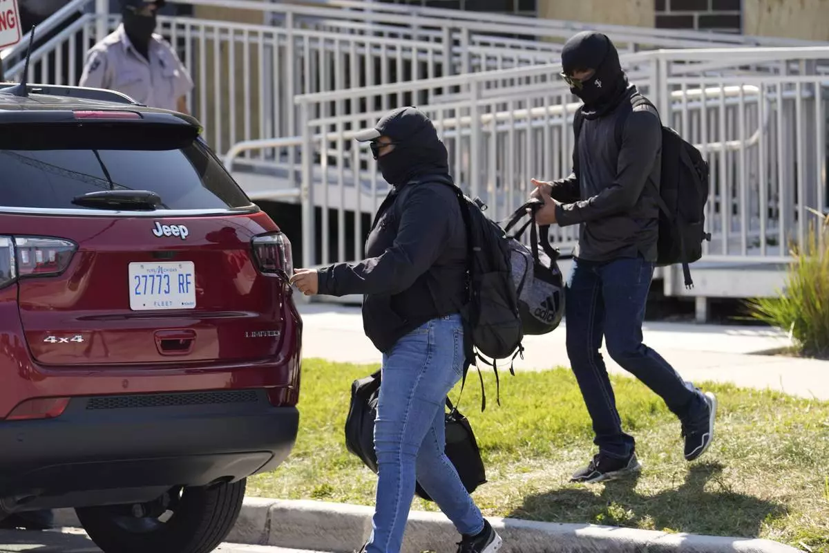 Masked people leave an immigration processing center Monday, Sept. 8, 2025, in Broadview, Ill., a suburb of Chicago. (AP Photo/Carolyn Kaster)