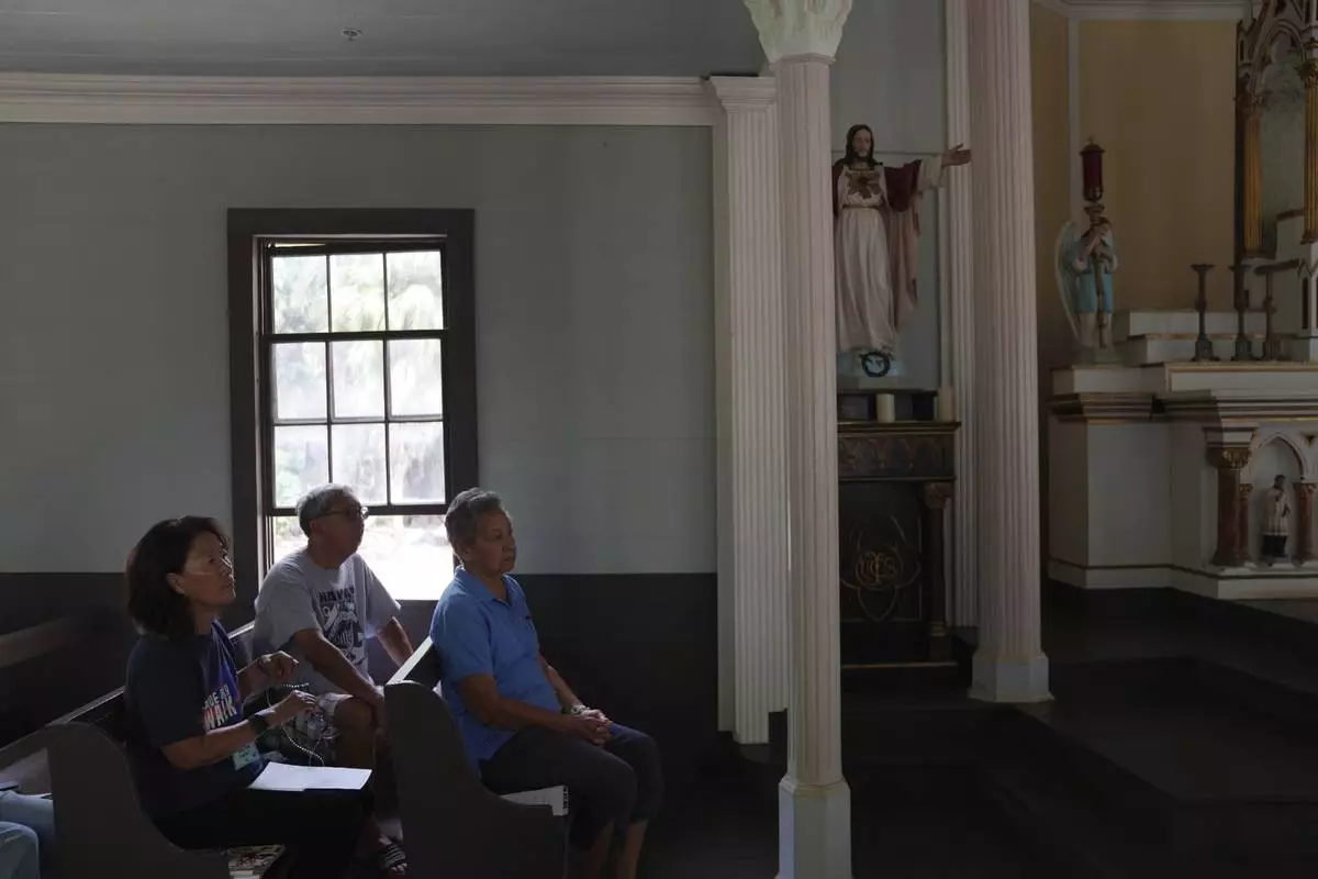 FILE - Kyong Son Toyofuku, left, her husband, Lance Toyofuku, center, and sister Alicia Damien Lau, celebrate Mass at St. Philomena Church during a pilgrimage tour of Kalaupapa, Hawaii, July 18, 2023. (AP Photo/Jessie Wardarski, File)