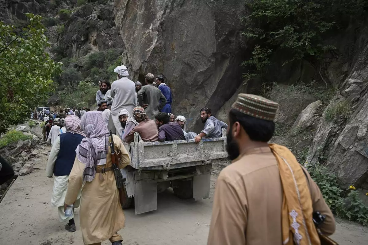 Residents from surrounding towns and villages try to reach the quake-hit region to assist survivors after Sunday night's powerful 6.0-magnitude earthquake that struck several provinces, in the Nurgol district, Kunar province, eastern Afghanistan, Tuesday, Sept. 2, 2025. (AP Photo/Nava Jamshidi)