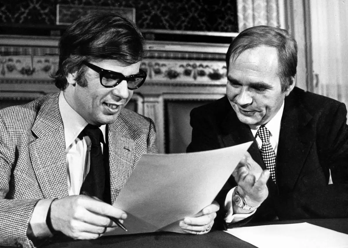 FILE - The future director of the Hamburg State Opera, Christoph von Dohnanyi, left, and the then Hamburg Senator for Culture Dieter Biallas, in Hamburg City Hall after signing the contract, in Hamburg, Germany, Dec. 4, 1974. (Werner Baum/dpa via AP, File)