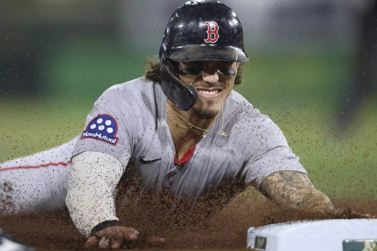 Boston Red Sox's Jarren Duran slides into third base for a steal during the fifth inning of a baseball game against the Athletics, Monday, Sept. 8, 2025, in West Sacramento, Calif. (AP Photo/Scott Marshall)
