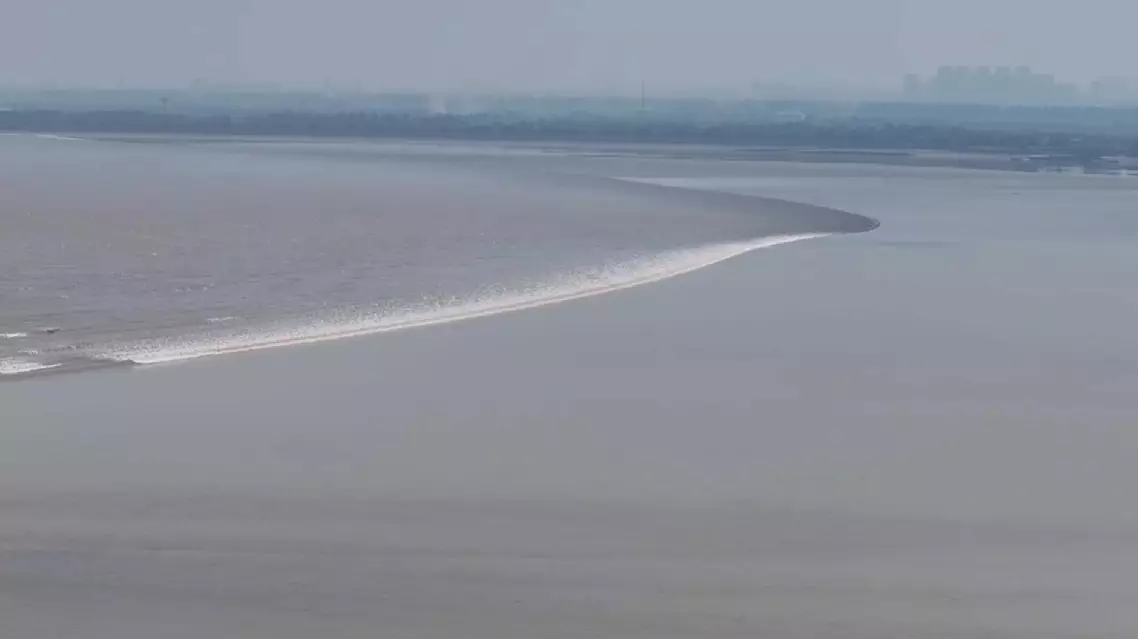 Around 12:15 at noon, a white ribbon appeared at the junction of water and sky, and the water waves rushed closer, clashed together, and eventually formed a giant tide line, wowing every spectator on the riverside.