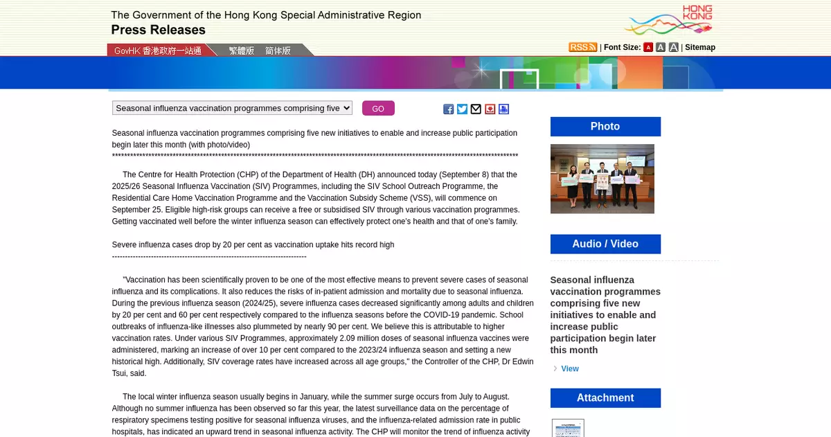 The DH announced yesterday (September 8) that the 2025/26 SIV Programmes would commence on September 25 to provide a free or subsidised SIV to eligible high-risk groups through various vaccination programmes. A number of new initiatives have been introduced to encourage and enable public participation, including further enhancing the SIV School Outreach Programme so that all schools may choose to use the live attenuated influenza vaccine (LAIV nasal vaccines) and "hybrid mode", i.e. schools being allowed to choose both injectable inactivated influenza vaccines (IIV) and LAIV for the same or different outreach vaccination activities. Approximately 2 300 schools (99 per cent) have joined the outreach programme. To safeguard students' health, the CHP will publish a list of schools not participating in the programme on its official website to remind parents to promptly arrange for children in those schools to receive vaccinations from family doctors.