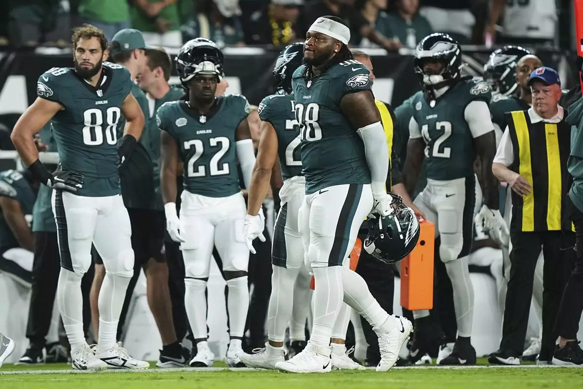 Philadelphia Eagles defensive tackle Jalen Carter walks off the field after being disqualified for unsportsman like conduct before an NFL football game against the Dallas Cowboys Thursday, Sept. 4, 2025, in Philadelphia. (AP Photo/Matt Slocum)