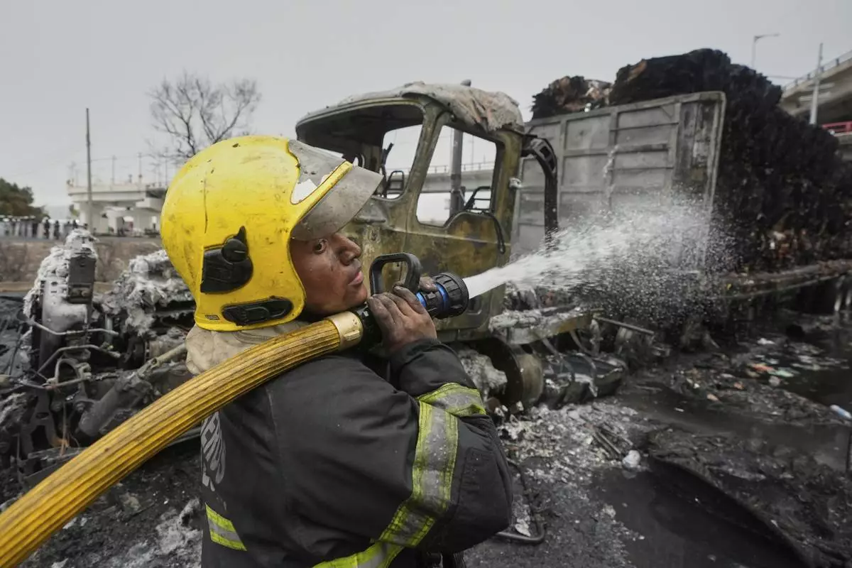 The gas tanker laying on its side had the logo of the energy business Silza on its side, but in a call with The Associated Press a company official who did not want to be identified denied it was their vehicle. The company did not immediately respond to an email requesting for comment or more details.