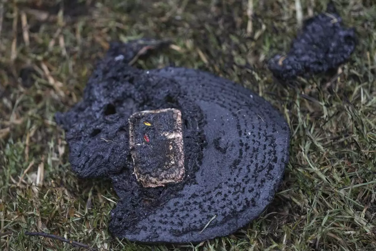 A burned hat sits on the grass after a gas tanker exploded in Mexico City, Wednesday, Sept. 10, 2025. (AP Photo/Fernando Llano)