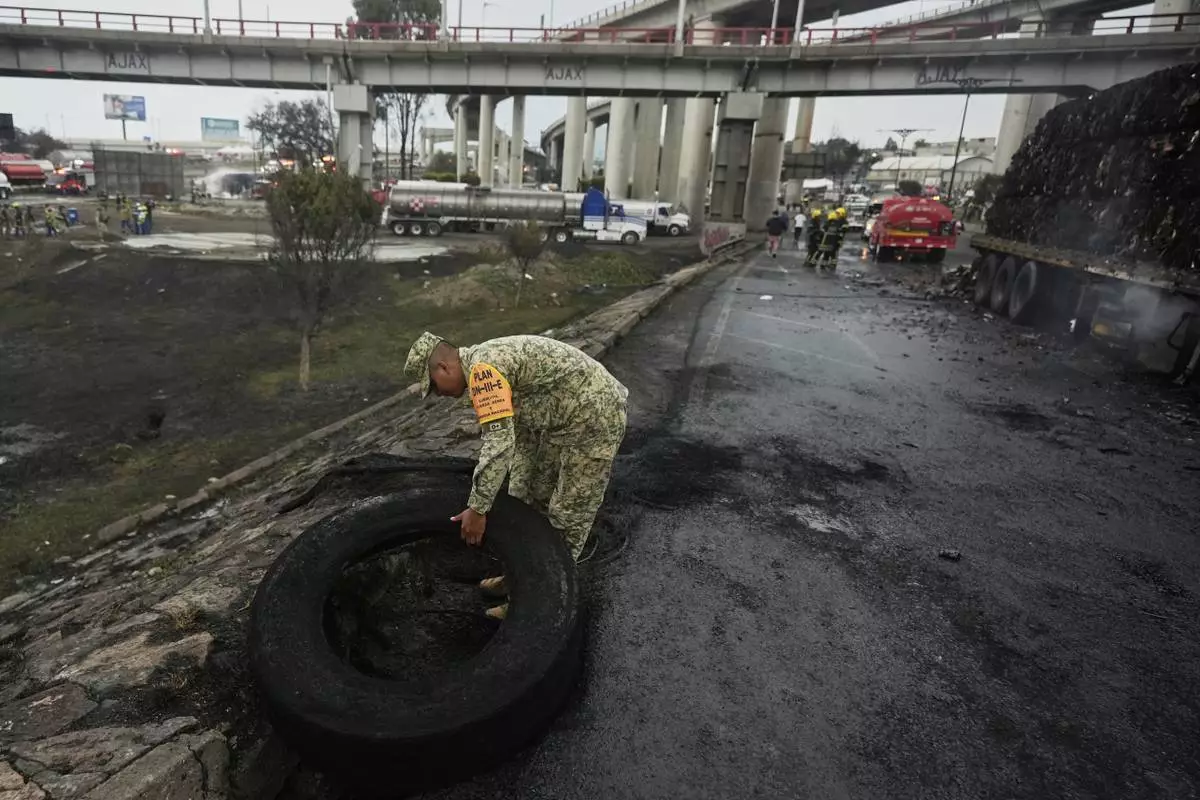 A soldier removes a burned tire from the scene of a gas tanker explosion in Mexico City, Wednesday, Sept. 10, 2025. (AP Photo/Fernando Llano)