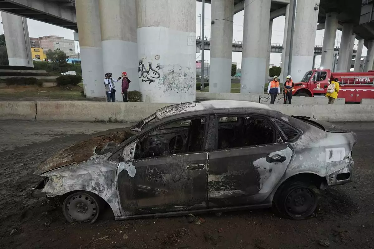 A burned car sits below an underpass following a gas tanker explosion in Mexico City, Wednesday, Sept. 10, 2025. (AP Photo/Fernando Llano)