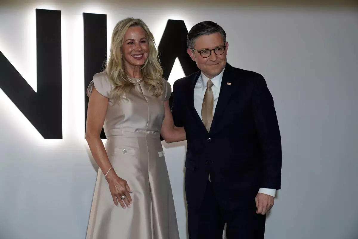 House Speaker Mike Johnson of La., and his wife Kelly arrive for the premiere of first lady Melania Trump's movie "Melania" at The John F. Kennedy Memorial Center For The Performing Arts, Thursday, Jan. 29, 2026, in Washington. (AP Photo/Jose Luis Magana)