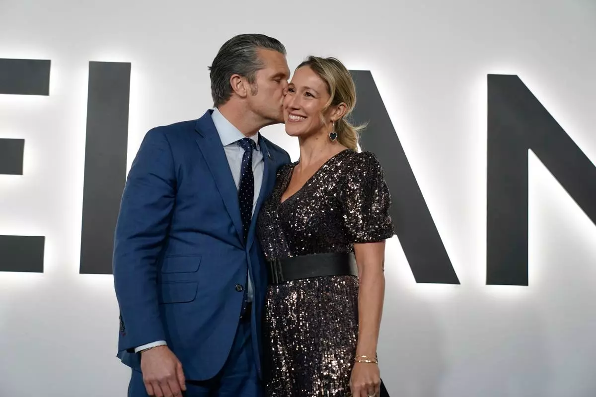 Defense Secretary Pete Hegseth and his wife Jennifer arrive for the premiere of first lady Melania Trump's movie "Melania" at The John F. Kennedy Memorial Center For The Performing Arts, Thursday, Jan. 29, 2026, in Washington. (AP Photo/Jose Luis Magana)