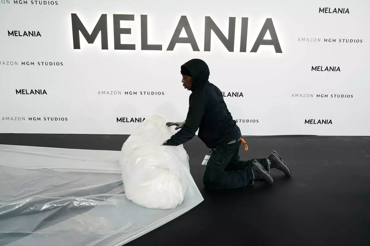 A worker removes plastic from the carpet before the premiere of first lady Melania Trump's movie "Melania" at The John F. Kennedy Memorial Center For The Performing Arts, Thursday, Jan. 29, 2026, in Washington. (AP Photo/Jose Luis Magana)