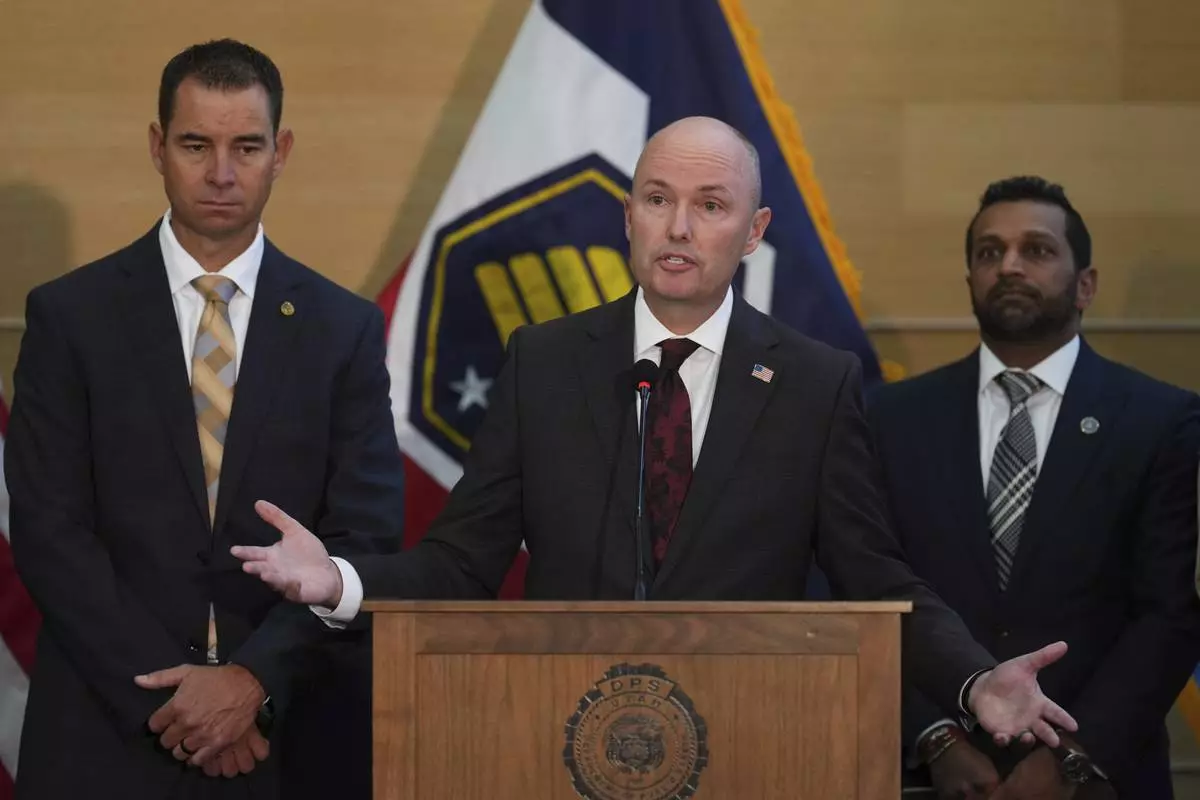 Utah Gov. Spencer Cox speaks at a news conference, as Utah department of public safety commissioner Beau Mason, left, and FBI Director Kash Patel listens, Friday, Sept. 12, 2025, in Orem, Utah,(AP Photo/Lindsay Wasson)