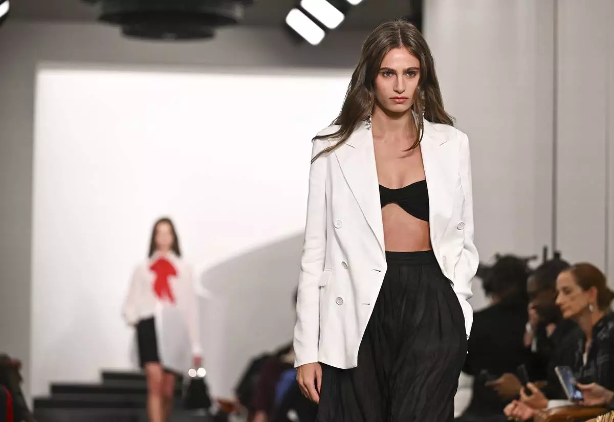 What guests inside saw was a Spring 2026 collection that leaned strongly into Lauren’s signature menswear-for-women look, with roomy but tailored jackets open to reveal bralette tops, paired with wide trousers or skirts. The key color for jackets and coats was crispy white, as in the very first item, a long white polo coat open to reveal a black bra top with black trousers.