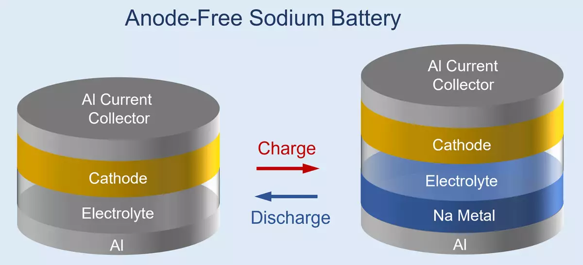 Charging and discharging processes of anode-free sodium batteries. During charging, sodium (Na) metal is deposited on the aluminium (Al) current collector, and during discharging, sodium returns to the cathode.