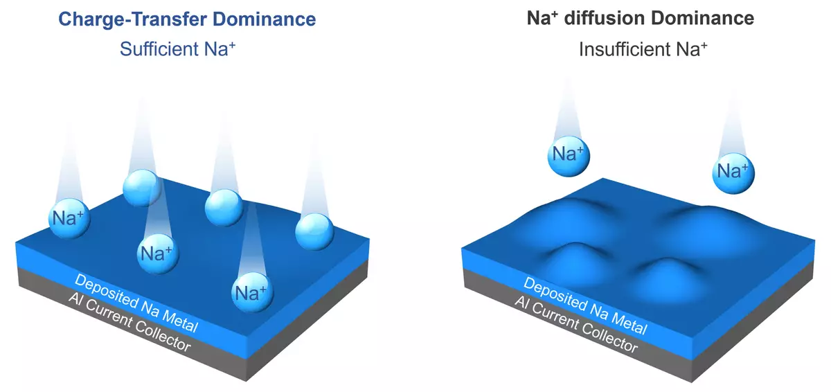 Sodium deposition under conditions dominated by charge transfer and sodium-ion diffusion. Under charge-transfer-dominated conditions with sufficient Na+ supply, sodium metal deposits uniformly on the Al current collector. Under diffusion-dominated conditions, where the Na+ supply is insufficient, sodium metal deposits non-uniformly, leading to short circuits.