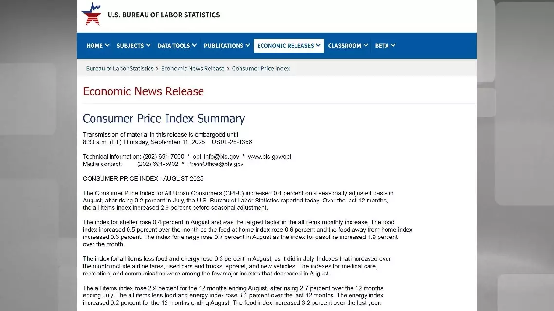 The consumer price index, a broad measure of the cost of goods and services across the U.S. economy, rose 2.9 percent year on year without seasonal adjustment in August, the country's Bureau of Labor Statistics reported Thursday.