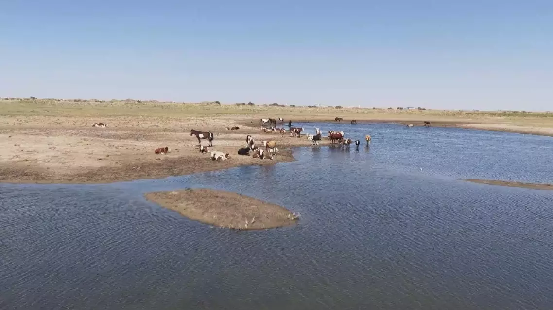 Due to excessive agricultural irrigation, the lake dried up in 1972, but now it is presenting an early autumn landscape with abundant water and grass. Today, more than 20 herders are grazing their livestock here.