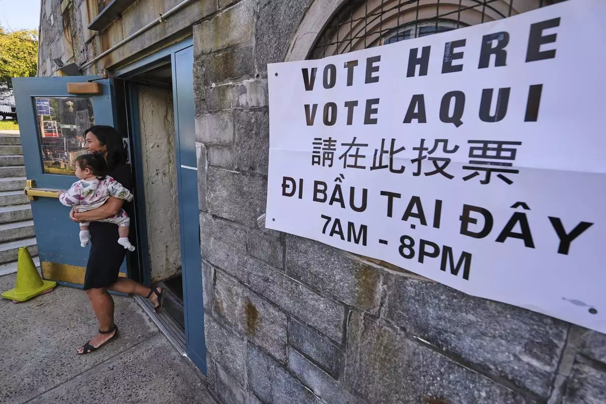 Boston Mayor Michelle Wu carries her daughter Mira after voting at a polling place, Tuesday, Sept. 9, 2025, in the Roslindale neighborhood of Boston. (AP Photo/Charles Krupa)