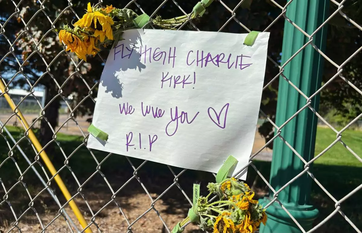 A sign reading “Fly High Charlie Kirk! We love you. R.I.P.” is seen hanging on a fence with flowers across the street from the Utah Valley University campus, in Orem, Utah, Thursday, Sept. 11, 2025. (AP Photo/Hannah Schoenbaum)