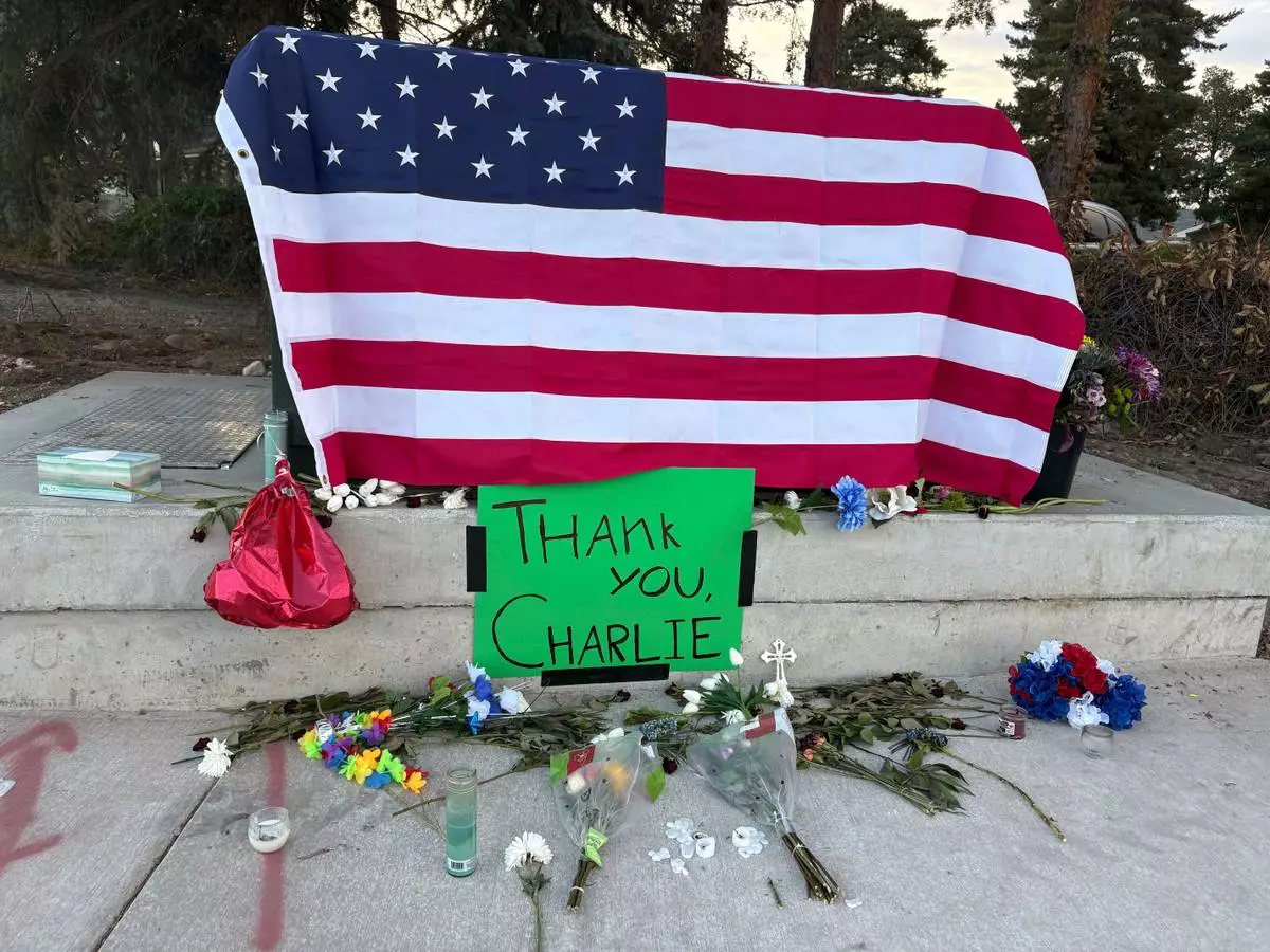 A makeshift memorial for Charlie Kirk is seen on the Utah Valley University campus in Orem, Utah, on Thursday, Sept. 11, 2025. (AP Photo/Hannah Schoenbaum)