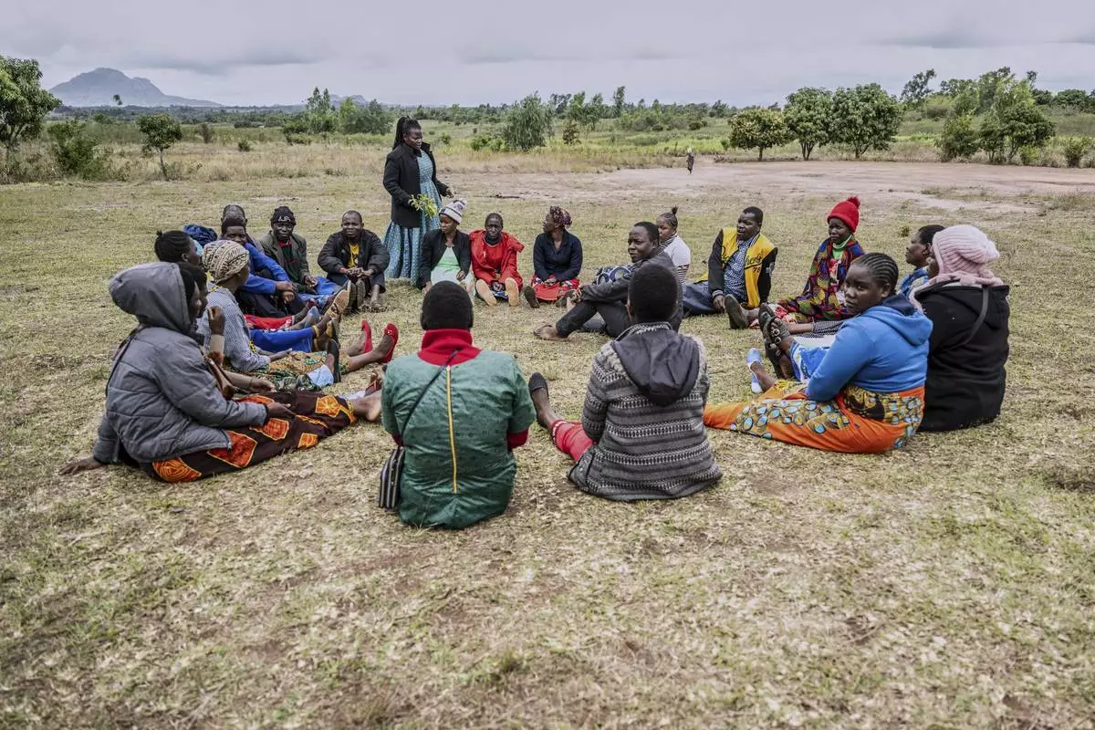 Smallholder farmers hold a meeting in Mulanje, southern Malawi, Tuesday, July 29, 2025. (AP Photo/Thoko Chikondi)