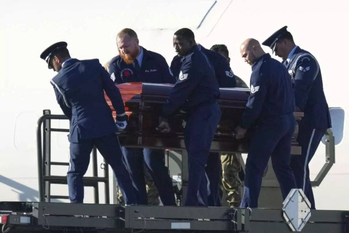 The casket containing the body of Charlie Kirk, the CEO and co-founder of Turning Point USA who was shot and killed on Wednesday is removed from Air Force Two at Phoenix Sky Harbor International Airport, Thursday, Sept. 11, 2025, in Phoenix. (AP Photo/Ross D. Franklin)