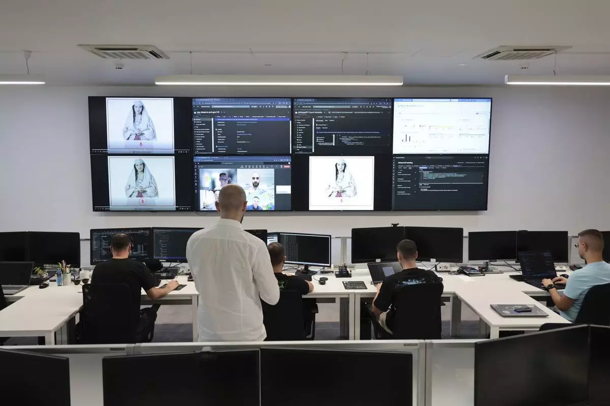 Albanian experts work at the National Agency for Information Society as an artificial intelligence "minister" Diella, whose name means "Sun" in Albanian, is seen on the screens in Tirana, Albania, Friday, Sept. 12, 2025. (AP Photo/Vlasov Sulaj)
