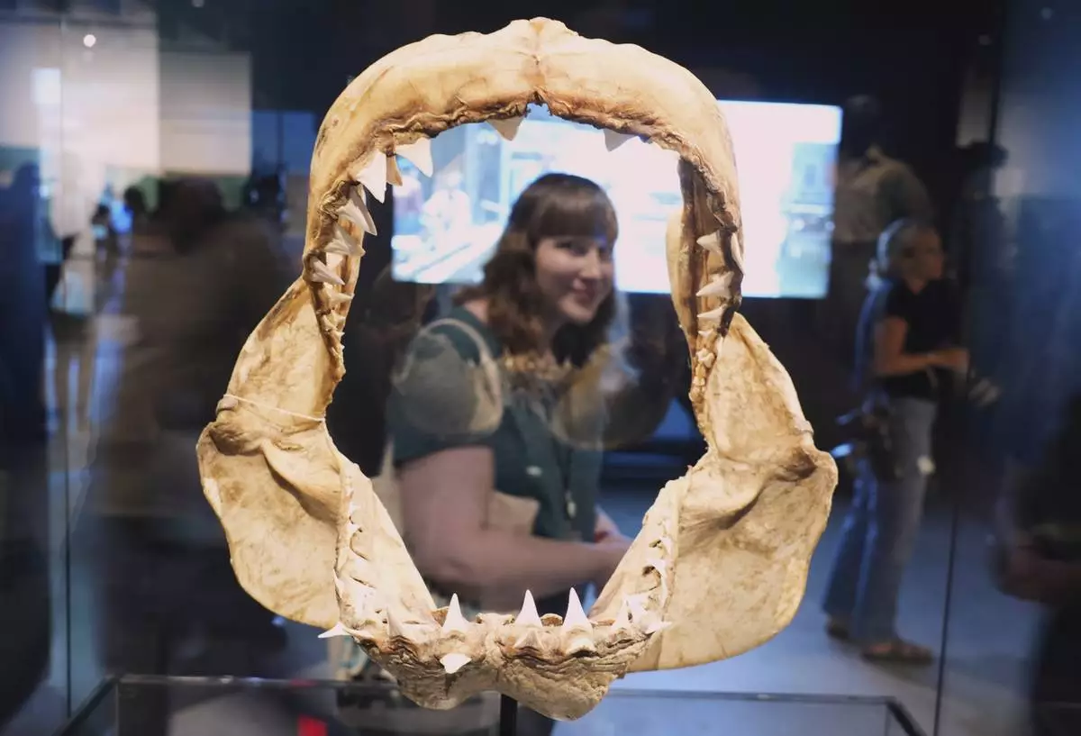 Megan Grouchow is seen through a set of great white shark jaws used for research and set decoration for the film "Jaws" during the "Jaws: The Exhibition" press preview on Wednesday, Sept. 10, 2025, at the Academy Museum of Motion Pictures in Los Angeles. (AP Photo/Chris Pizzello)