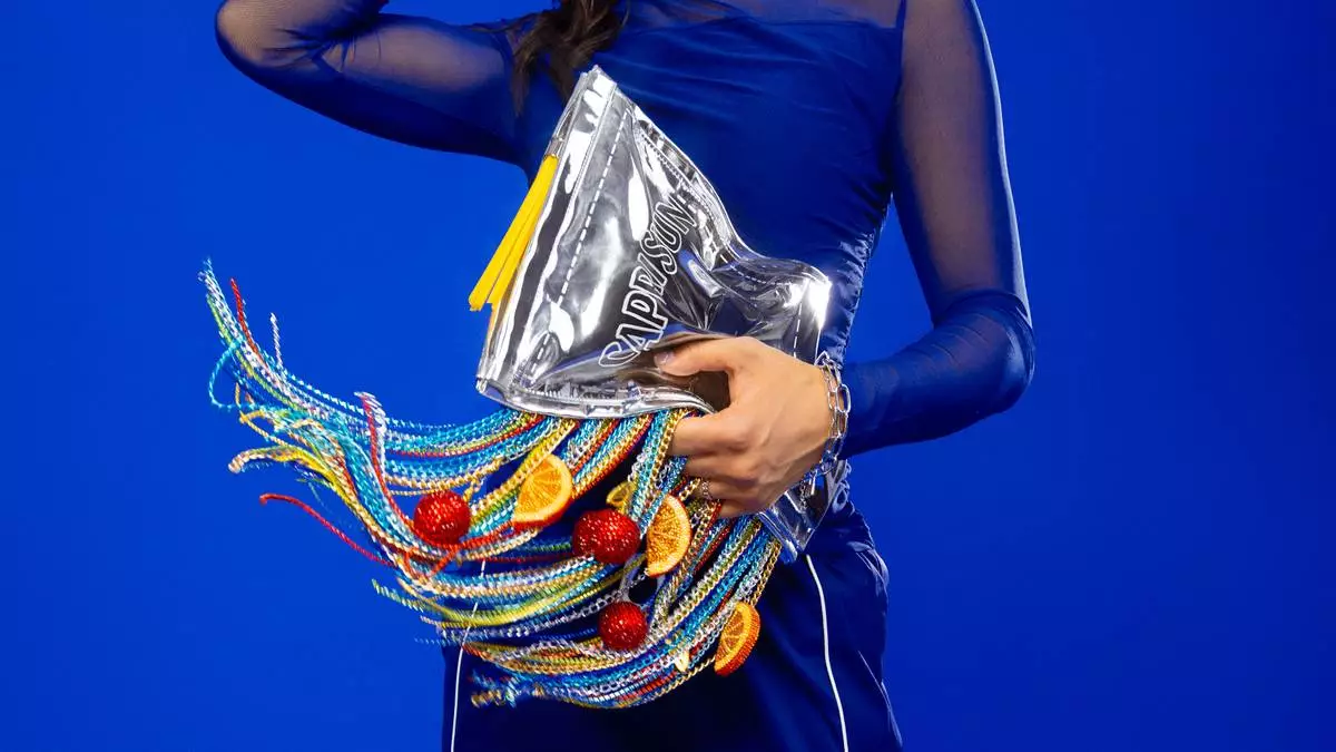 Featuring a silver silhouette mimicking the pouch’s signature squeeze, the purse is adorned with dangling fruit charms, vibrant chains, and the final touch of a zipper made from the brand’s iconic yellow straws.