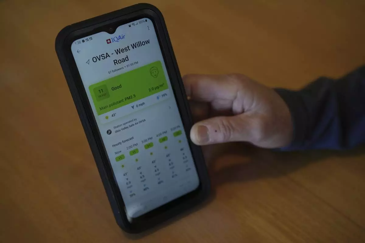 FILE - Mary Hess displays air quality data on the IQAir app on her phone, April 8, 2025, in Dale, Ind. (AP Photo/Joshua A. Bickel, File)