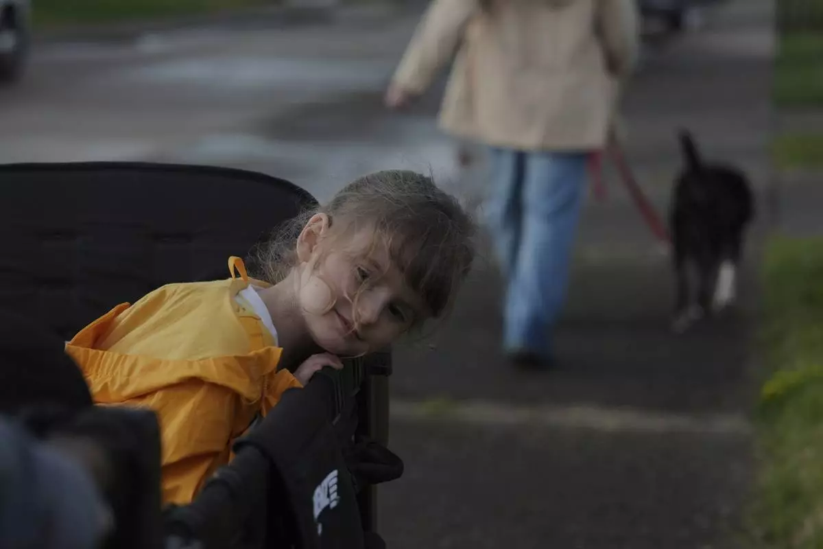FILE - Eliza Ethridge, 5, rides in a wagon during a walk with her family, April 10, 2025, in Evansville, Ind. (AP Photo/Joshua A. Bickel, File)