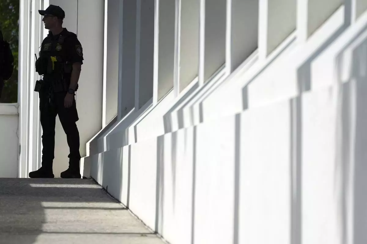 A law enforcement officer from the Department of Homeland Security stands watch at the Alto Lee Adams Sr. U.S. Courthouse as jury selection began in the trial of Ryan Routh, charged with trying to assassinate Donald Trump while he played golf last year in South Florida, Monday, Sept. 8, 2025, in Fort Pierce, Fla. (AP Photo/Rebecca Blackwell)