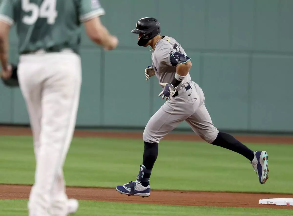 New York Yankees designated hitter Aaron Judge rounds second base after hitting a home run during the first inning of a baseball game against the Boston Red Sox, Friday, Sept. 12, 2025, in Boston. (AP Photo/Mark Stockwell)