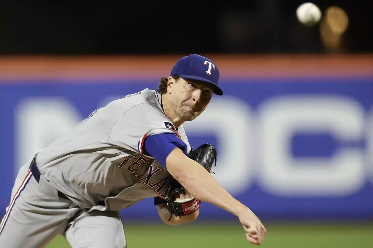 Texas Rangers pitcher Jacob deGrom throws during the second inning of a baseball game against the New York Mets, Friday, Sept. 12, 2025, in New York. (AP Photo/Adam Hunger)
