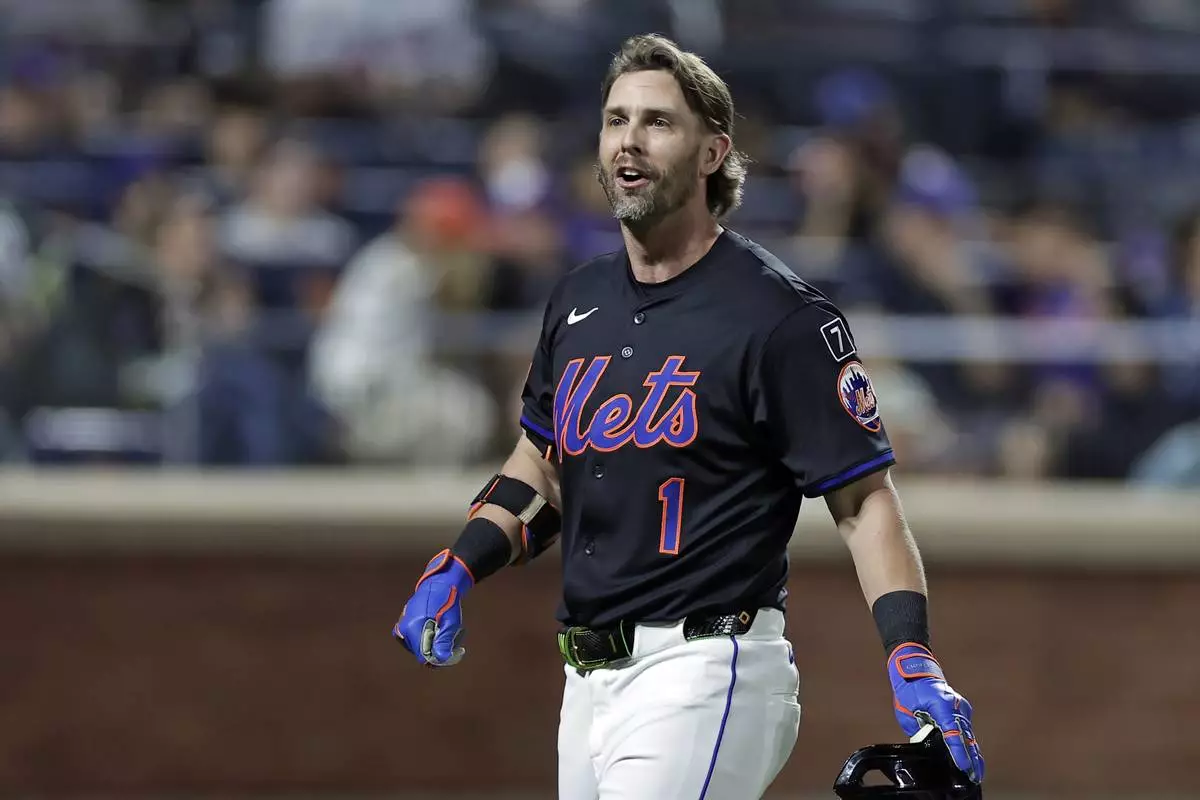 New York Mets' Jeff McNeil reacts after he was thrown out of a baseball game for arguing balls and strikes during the fourth inning against the Texas Rangers, Friday, Sept. 12, 2025, in New York. (AP Photo/Adam Hunger)