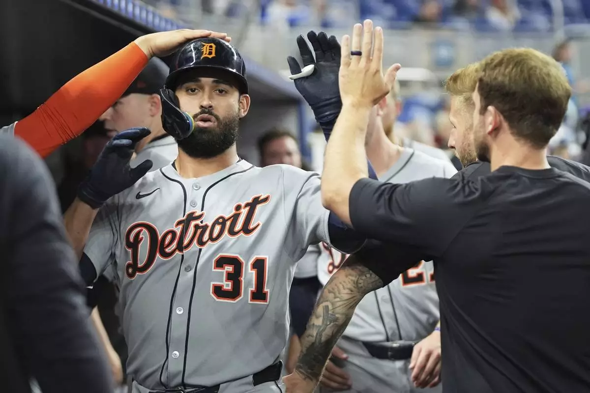 Detroit Tigers' Riley Greene (31) is congratulated in the dugout after hitting a solo home run during the fourth inning of a baseball game against the Miami Marlins, Friday, Sept. 12, 2025, in Miami. (AP Photo/Lynne Sladky)