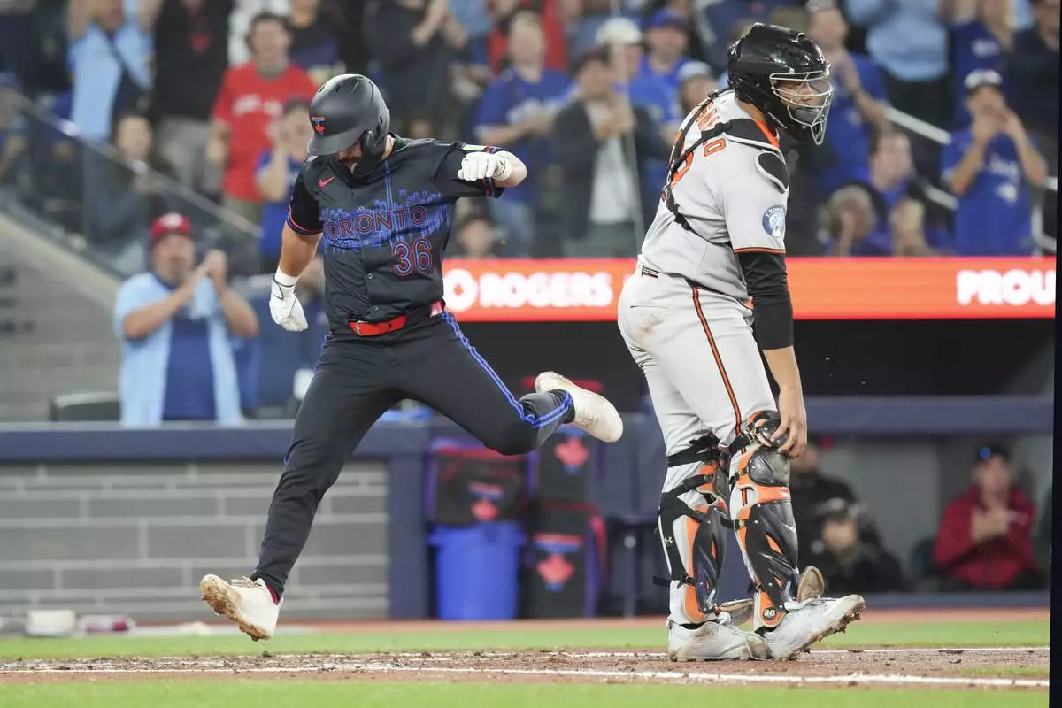 Toronto Blue Jays' Davis Schneider (36) scores as Baltimore Orioles catcher Samuel Basallo (29) looks on during fifth inning MLB baseball action in Toronto, Friday Sept. 12, 2025. (Chris Young/The Canadian Press via AP)