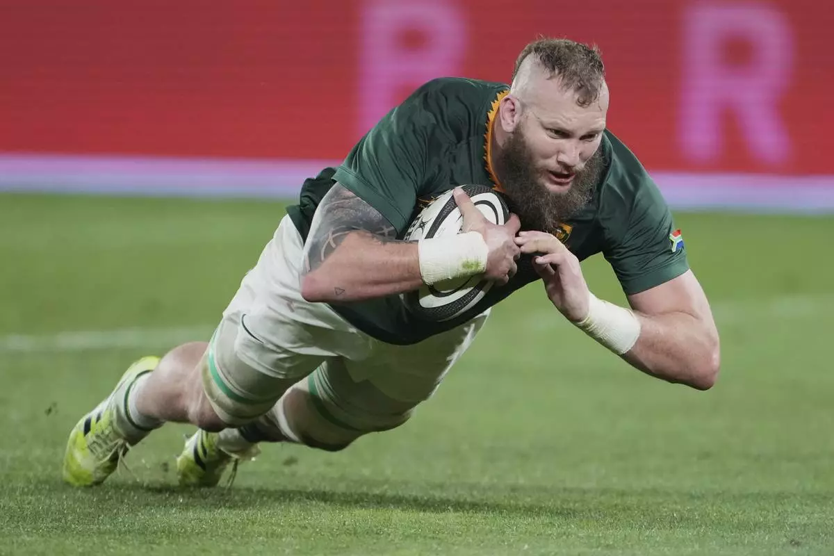 South Africa RG Snyman scores a try their Rugby Championship test match against New Zealand in Wellington, New Zealand, Saturday, Sept. 13, 2025. (AP Photo/Marty Melville)