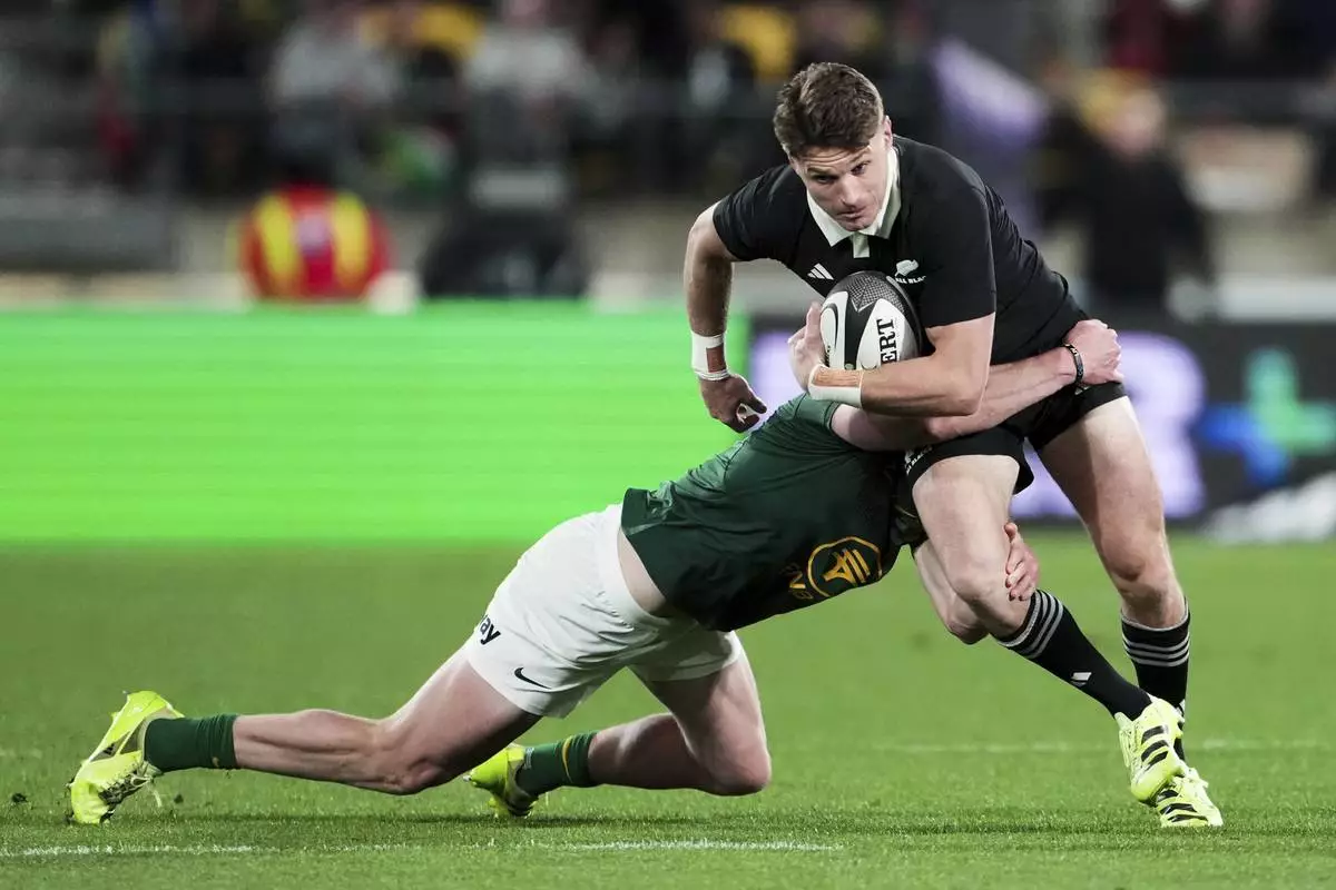 All Blacks Beauden Barrett, right, is tackled by South Africa's Ethan Hooker during their Rugby Championship test match in Wellington, New Zealand, Saturday, Sept. 13, 2025. (AP Photo/Marty Melville)