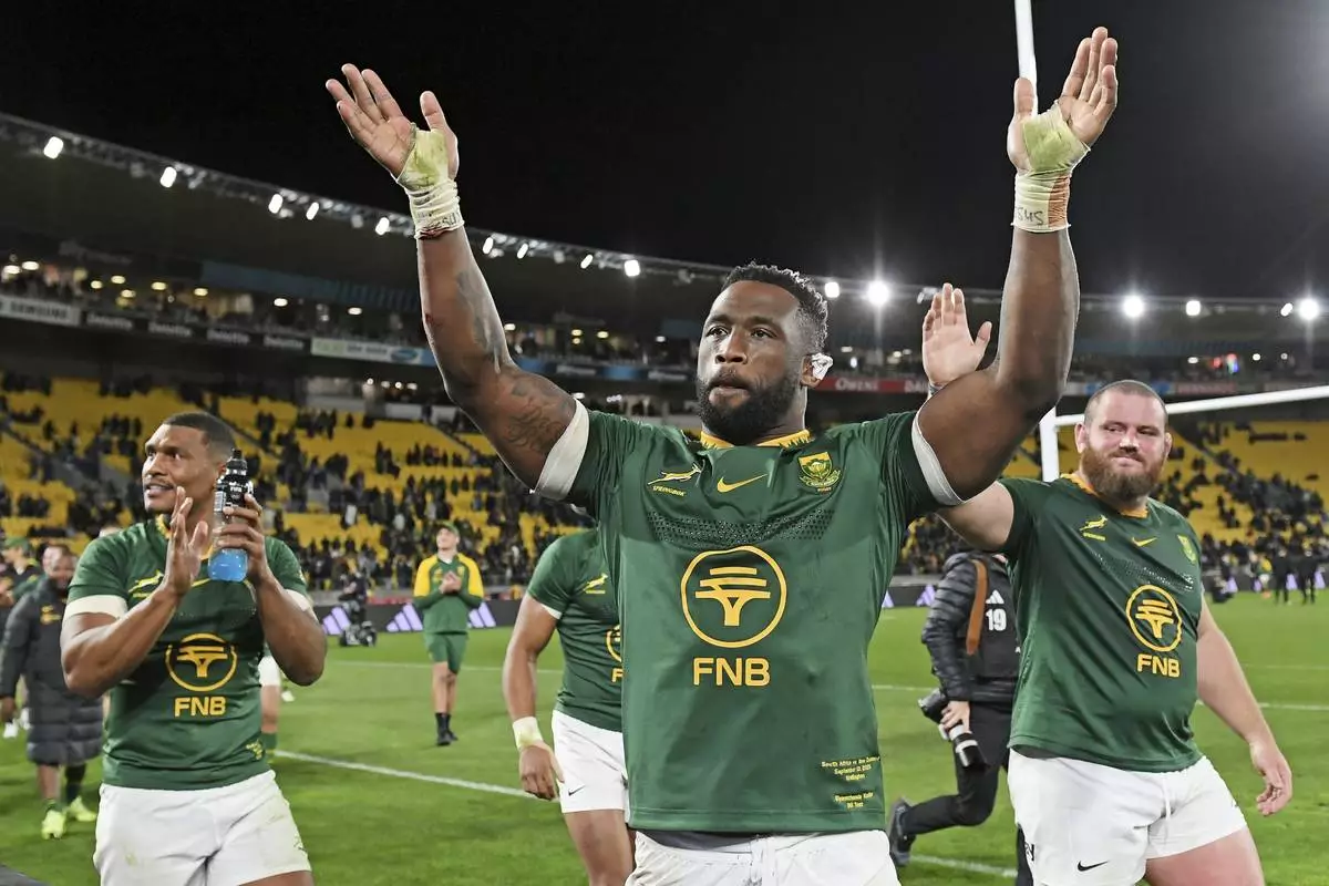 Springbok captain Siya Kolisi waves to supporters after defeating the All Blacks in their Rugby Championship test match in Wellington, New Zealand, Saturday, Sept. 13, 2025. (AP Photo/Kerry Marshall)