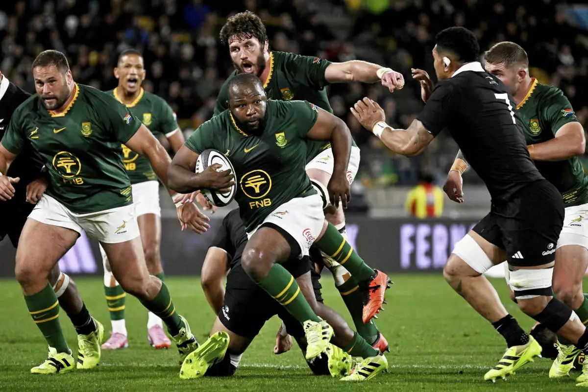Ox Nche of South Africa runs at the defence during their Rugby Championship test match against the All Blacks in Wellington, New Zealand, Saturday, Sept. 13, 2025. (AP Photo/Masanori Udagawa)
