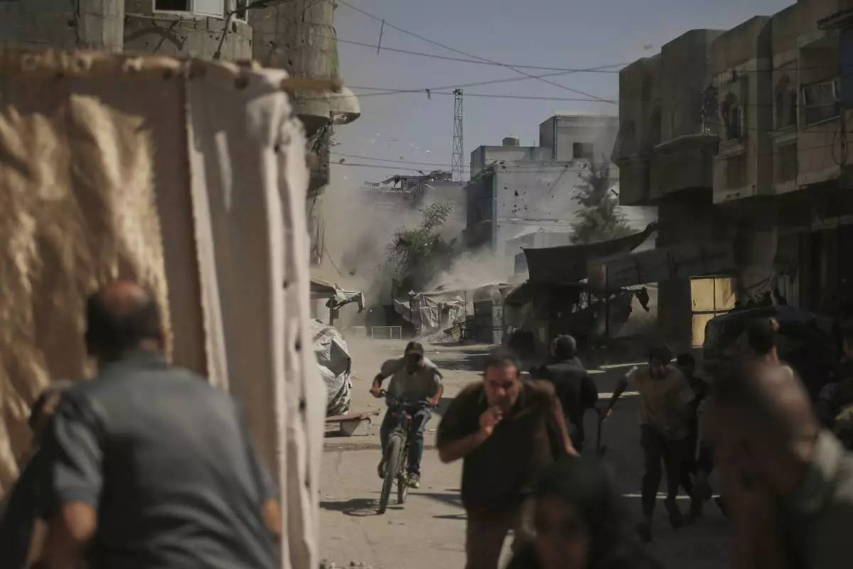 Palestinians run for cover during an Israeli military strike on a building in Gaza City, Saturday, Sept. 13, 2025. (AP Photo/Yousef Al Zanoun)