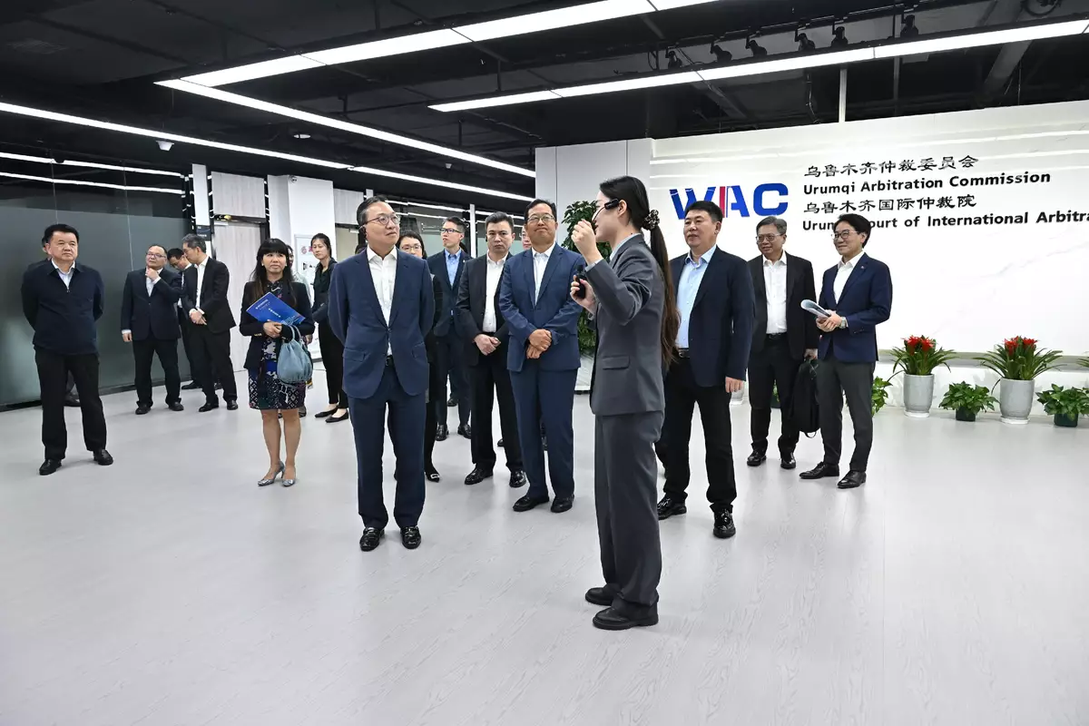 After attending a luncheon with Deputy Secretary of the CPC Xinjiang Uyghur Autonomous Regional Committee, Mr Chen Mingguo, at noon, Mr Lam and the delegation visited the Silk Road Economic Belt Legal Service District and the Urumqi Court of International Arbitration to learn about their operations. The Silk Road Economic Belt Legal Service District provides high-quality legal services for local Belt and Road economic and trade co-operation. It aims to actively bring in more foreign-related legal service institutions with international influence to serve the development of core zones in the China (Xinjiang) Pilot Free Trade Zone and the Silk Road Economic Belt.