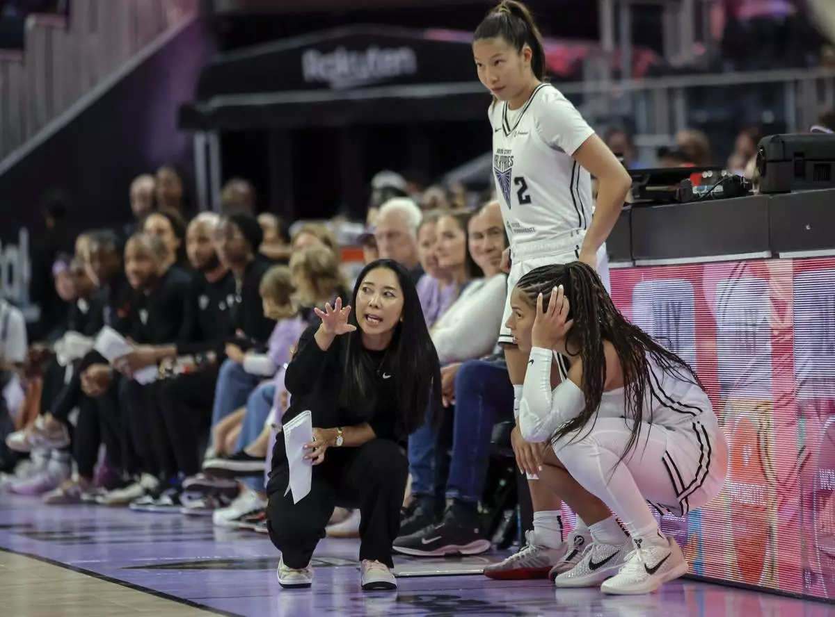 Coach Natalie Nakase talks to Veronica Burton (22) and Kaitlyn Chen (2) before they sub in in the first half as the Golden State Valyries played the Dallas Wings at Chase Center San Francisco on , Thursday, Sept. 4, 2025. (Carlos Avila Gonzalez/San Francisco Chronicle via AP)