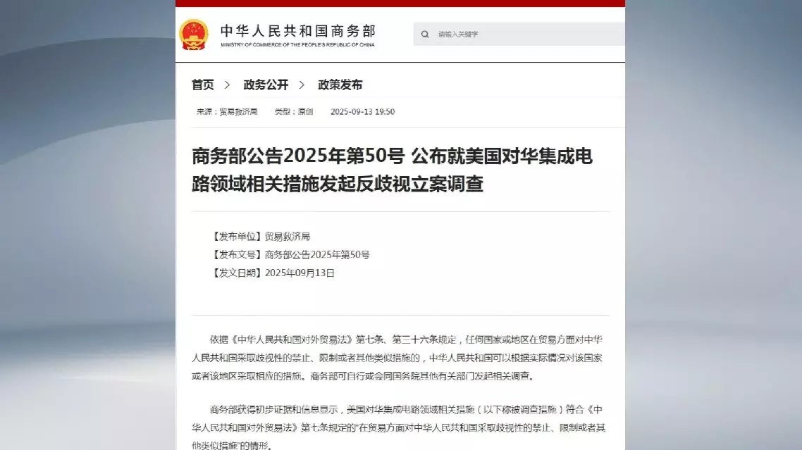 China's Ministry of Commerce on Saturday announced the launch of an anti-discrimination investigation into relevant U.S. measures targeting the country's integrated circuit sector, effective the same day.