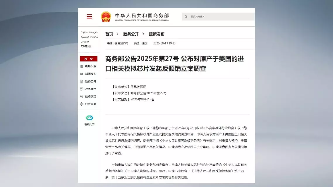 China's Ministry of Commerce announced on Saturday that it has initiated an anti-dumping investigation into imports of certain analog IC chips originating from the United States.