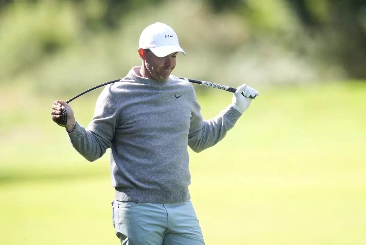 Rory McIlroy reacts during the third round of the BMW PGA Championship golf tournament, Saturday, Sept. 13, 2025, at Wentworth Golf Club in Virginia Water, England. (Adam Davy/PA via AP)